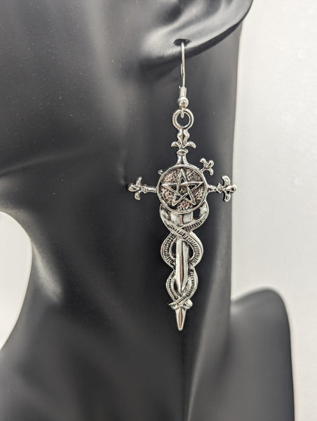 Sword earrings, statement earrings, gamer geek gifts, gothic earrings, gothic jewelry, dagger earrings, pentagram earrings, pentagram gifts,